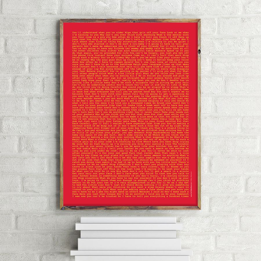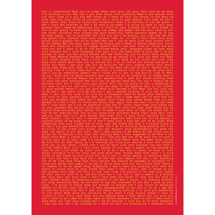 Das Plakat plädiert für den würdevollen Umgang zwischen Kindern und Erwachsenen. Das kinderrechtliche Motto lautet: Gleichberechtigung der Generationen! Die Elternsprüche verdeutlichen typische Situationen, in denen Kinder herabwürdigend und würdelos von Erwachsenen behandelt werden. Die große Menge und Anordnung ohne Punkt und Komma hintereinander weg geschrieben lässt den Betrachter und Leser "untergehen" wie in einem uferlosen Meer. Er fühlt sich "erschlagen" und beginnt nach- und umzudenken. Das knallig-rote, auffällige Plakat im Flur oder Büro verleitet zum Hingucken und belustigt zunächst. Gleichzeitig erinnert es die Betrachter an ihre Kindheit oder sie denken ertappt an die ihnen anvertrauten Kinder. Ganz unverhofft unterhalten sich dann Eltern, Erzieher und Lehrer über pädagogische Grundfragen. Das Plakat kommt ohne Erklärung aus - viele gucken es immer wieder an und vergessen die Lektüre kaum.