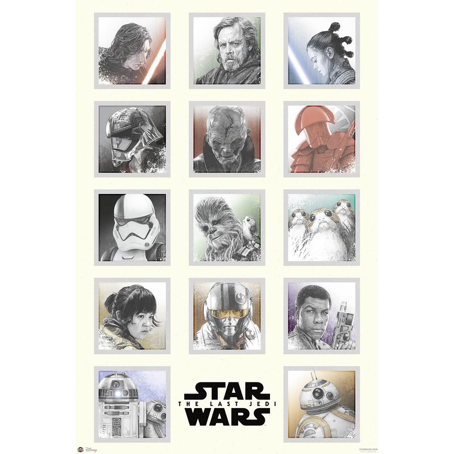 Ein malerisches Filmplakat zu Star Wars Episode VIII – The last Jedi. Das Poster zeigt 10 Charaktere der Star Wars Saga in Kacheln in einer kunstvollen Weise. Zu sehen sind unter anderem: Kylo Ren, Chewbacca, Porgs, R2D2, Captain Phasma, Finn, Luke Skywalker und mehr. Das epische Filmposter ist ein Must-Have für jeden Star Wars Fan, der Wert auf eine stilvolle Wohnungseinrichtung legt. Offiziell lizenzierter Star Wars Fanartikel!